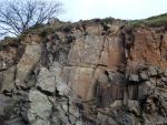 Cet affleurement de roche vert sombre et brillante est un vestige de plancher océanique vieux de 400 millions d’années. La roche fortement plissée et profondément transformée par les forces colossales mises en œuvre lors de la fermeture de cet océan, est appelée serpentinite, en raison de son aspect lorsqu’elle est polie, qui évoque une peau de serpent. Elle contient plus de 70 % de minéraux riches en fer et en magnésium et est également très riche en métaux lourds.